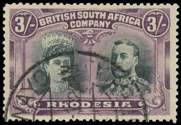 3/- green and violet, Long Gash plate, position 21 used with part Bulawayo DC. SG 158