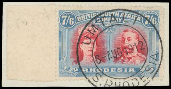 7s6d carmine and pale blue left marginal example on small piece, superb Umtali DC 6 AUG 1912, a ‘by favour’ cancel. The reverse of the piece signed by Holcombe and Stephen Reah Johnson. SG 160b