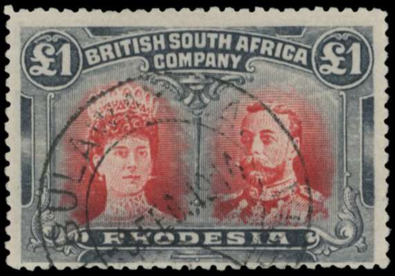 £1 carmine-vermilion and (indigo) grey-black, Long Gash plate, position 36. Commercially used with Bulawayo cds FEB 1914; rare. RSC A