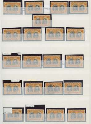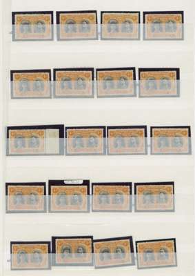 4d brown-purple and orange SG 139, positioned examples, 41 out of the 50. (The missing positions are 1-2, 15, 37, 41, 44 and 46-8.) All appear to be good - fine o.g. with the exception of positions 7 and 19 (used), 25, 27 and 29 (foxing), 26 (unused), 32 (extensive mounting), 33 (slight foxing); an extraordinary group