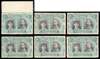 1/- grey-black and deep blue-green, Long Gash plate, six positioned examples: 4 top marginal, 5, 9 pawprint flaw, 14, 15 King's eyebrow line and 46 King's extra curl. Part or large part o.g. SG 151