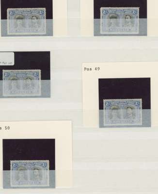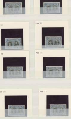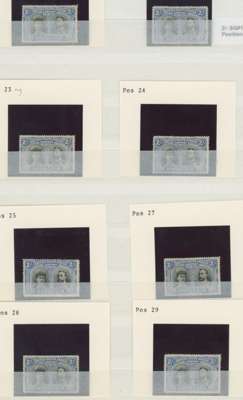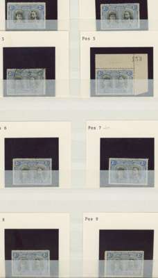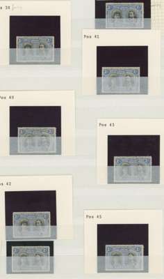 2/- black and ultramarine, Long Gash plate, partial reconstruction (45 positions out of the 50; all mint save for position 3). Lacks positions 4, 15, 20-1 and 26. Generally good to fine o.g.; faults noted on positions 14 (thinned), 23 (no gum), 30 (thinned), 38 and 39 (both foxed). Quite an achievement! SG 153