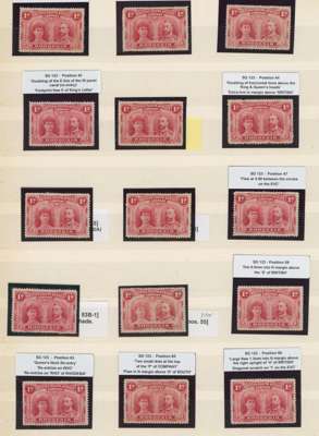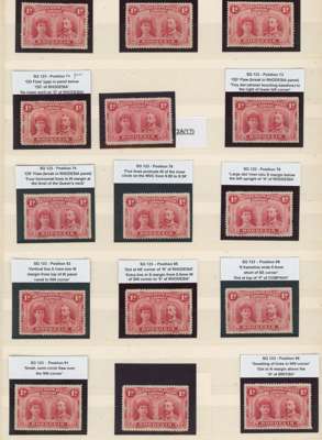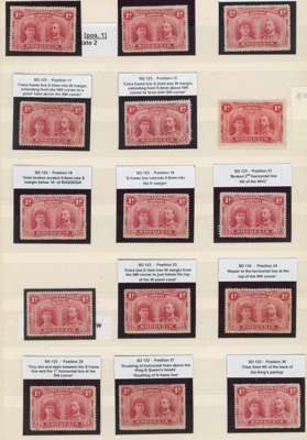 1d bright carmine, 48 plated mint examples on stocksheets, many ex Hensman. Includes positions 53 and 63 major re-entries, and 71-4 OD flaws. Some mixed condition but many good examples. SG 123