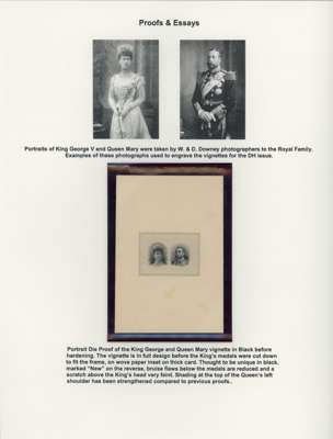 1910-13 die proof of King George V and Queen Mary vignette in black before hardening, the portrait in its full design before the medals were cut down to fit the frame, on wove paper inset on thick card (69x98), a beautiful and exceptionally rare item, neatly presented on exhibition page.