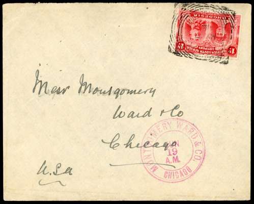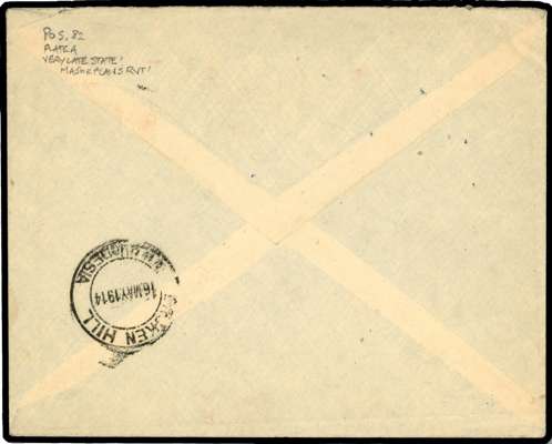 1914 (MY 7) cover from Petauke to USA, franked by 1910-13 1d carmine-lake from Plate A pos. 82 (a very late state showing major flaw in right-hand value tablet) (SG 124), tied by two strikes (one inverted) of ‘PETAUKE / N.E RHODESIA’ squared circle (Proud type D2) with recipient's arrival ds (JUN 19) below, backstamped at Broken Hill (16 MAY), a fine and rare franking.