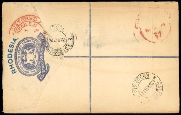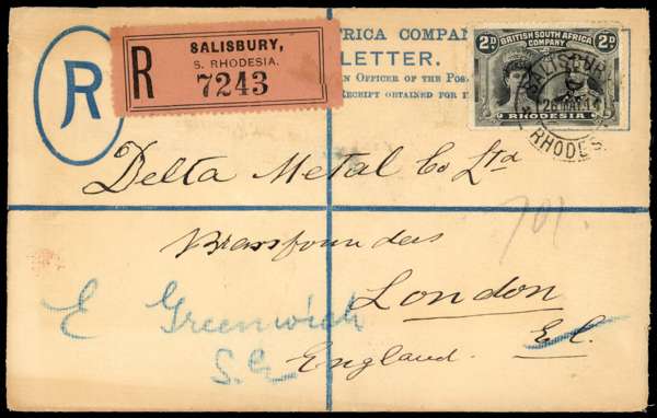 1914 (26 MAY) 4d blue registered postal stationery envelope (H&G C2), addressed to England and uprated with 1910-13 2d black and grey-black (SG 130), tied by ‘SALISBURY / RHODESIA’ cds (Proud type D8) with registration label at upper left and London arrival backstamp, a very neat and scarce commercial usage.