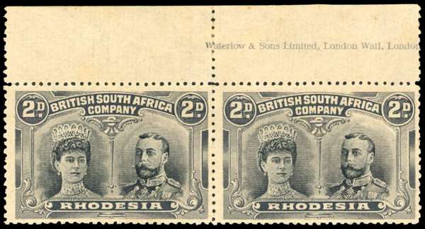 1910-13 2d slate-black and sepia-black, perf 14, 'thick ear' head plate, upper marginal pair with large part imprint, pos. 2-3. pos. 2 Queen's Thick Ear. A few blunt perfs at sides, otherwise good. RSC I