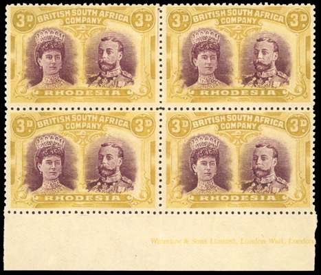 1910-13 3d maroon and ochre, perf 14, 'hook' head plate, lower marginal block of four with large part imprint, pos. 42-48. pos. 42 with printer's mark at upper right. Very fine o.g., unmounted save for a light hingemark on pos. 42; light vertical fold. SG 136a