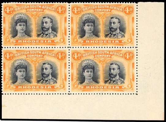 1910-13 4d greenish black and orange, perf 14, pos. 44-50 corner block of four, variant with slightly aniline frame and aniline green-black vignette. Fine large part o.g., with the lower pair unmounted. SG 138