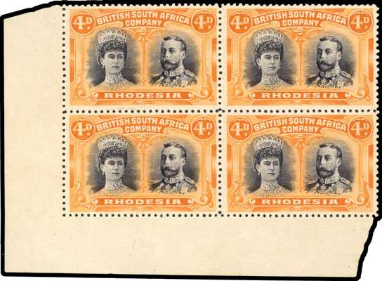 1910-13 4d deep brown-black and orange corner block, perf 14, 'long gash' head plate, pos. 41-7. pos. 46 King's extra curl, the heads with hints of sepia and violet. Fine o.g., lightly hinged on pos. 41 only, pos. 42 with a small natural inclusion; a very fine positional multiple. SG 140 variant ii