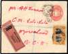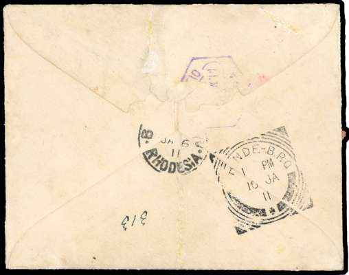 1911 (JA 6) 1d red p/s envelope, registered from Bulawayo to Nyasaland and uprated with 1910-13 4d black and orange (SG 140), tied by ‘BULAWAYO / RHODESIA’ cds (Proud type D5) and blue crayon line with registration label at lower left, backstamped at Beira and Chinde (10 JA), slight imperfections but a very scarce usage.