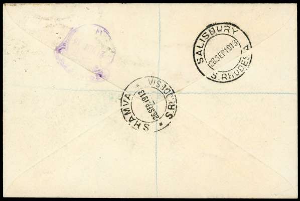 1913 (26 SEP) registered cover from Shamva to Germany, franked by 1909-12 2½d pale dull blue (SG 103) and 1910-13 4d black and orange (SG 140), tied by individual strikes of ‘SHAMVA / S. RHODESIA’ cds (Proud type D3) with registration label at upper left; backstamped at Salisbury (28 SEP) and London (21 OCT). A very neat and scarce franking.