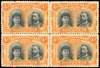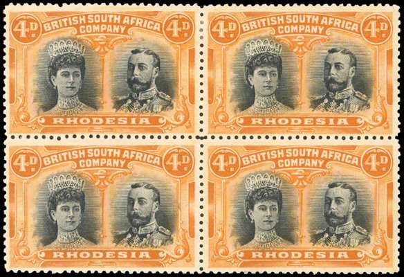 1910-13 4d grey-black and (dull) orange, perf 14 block of four, 'mid gash' head plate, pos. 11-17 with pos. 11 ‘snake’ flaw below King's medal. Large part o.g. with the lower pair unmounted, tiny natural inclusion on pos. 11 otherwise fine. A rare multiple. RSC A