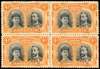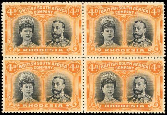 1910-13 4d black (worn) and orange, perf 14 block of four, 'hook' head plate, pos. 41-6. O.g., hinged on the upper pair only. pos. 42 with printer's mark at upper right, pos. 46-7 with bottom row marks. Scarce multiple. RSC B