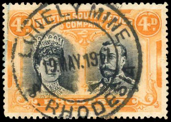 1910-13 4d blue-black and yellow-orange, perf 14, Queen's thick ear, used with almost-full Lonely Mine cds of 19 May 1917. Part light registration crayon at left. Small foxed area at base (largely under postmark), otherwise fine. RSC E
