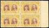 1910-13 5d reddish brown and Roman ochre (towards bright golden ochre), perf 14 marginal block of four, o.g., 'long gash' head plate, pos. 19-25. pos. 25 lines by King's cheek, this stamp with small hingemark, the other stamps unmounted. Rare multiple, a shade variant of RSC B