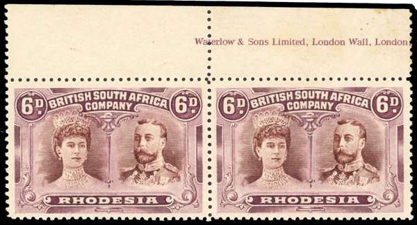 1910-13 6d brown-purple and deep rose-lilac, perf 14 upper marginal pair with large part imprint, 'long gash' head plate, pos. 2 long gash in Queen's ear. Unmounted o.g. and very well centered, light staining on reverse of selvedge above pos. 2, which just shows through to the front, the stamps really fresh and fine. RSC A