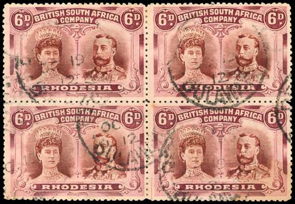 1910-13 6d lake-brown and (purplish) crimson, perf 14, 'short gash' head plate, pos. 2-8 block of four, used with Registered/Bulawayo cdss of OC 19 12. pos. 2 with short gash in Queen's ear, printer's mark between lower pair. Small imperfections, still an attractive and scarce multiple. RSC D