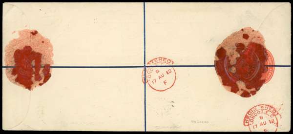 1912 (27 JUL) registered ‘ON POSTAL SERVICE’ envelope (242 x 108mm), used to Austria and franked by 1910-13 6d purple-brown and claret (RSC F), tied by ‘SALISBURY / RHODESIA’ cds (Proud type D8) with additional strike at right and registration label at left, backstamped at London (17 AU), a very fine and scarce usage.