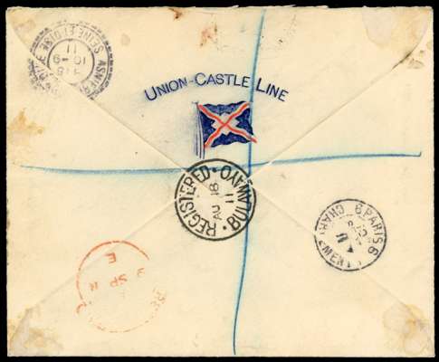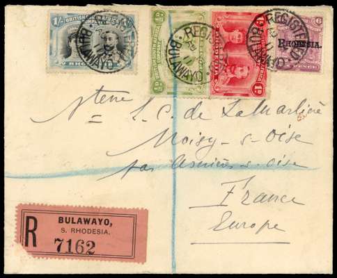 1911 (AU 18) registered cover (embossed ‘UNION-CASTLE LINE’ and flag imprint on flap) from Bulawayo to France, franked by 1909-12 6d reddish purple (SG 106), and 1910-13 ½d olive-green (SG 121 - defective), 1d rose-red (SG 125), and 1s black and deep blue-green (SG 151a), tied by ‘REGISTERED / BULAWAYO’ cds (Proud type R2) with registration at lower left, backstamped at London (9 SP) and Paris (10 Sep). A very rare commercial usage of the 1s value.