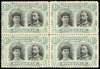 1910-13 1s black and pale blue-green block of four, perf 14, 'mid gash' head plate, pos. 43-9. O.g., pos. 44 ‘Mid Gash Roller Die flaw’; a fine and scarce multiple. SG 152