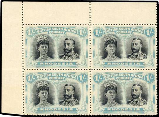 1910-13 1s black and bright turquoise-blue, perf 14, 'no gash' head plate, upper left corner block of 4. Large part o.g. with pos. 6 unmounted. Light horizontal fold between, otherwise a fine and extremely important multiple. RSC H [This block holds a very special place in 'Double Head' history as it raised the question, 'Why no gash on pos. 2?' which led to the identification of the 'no gash' head plate.]