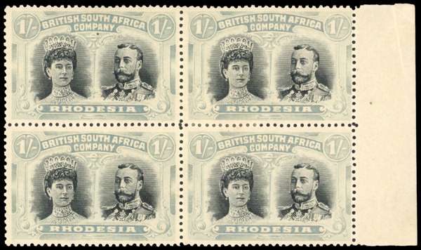 1910-13 1s black and pale blue marginal block of four, perf 14, 'no gash' head plate. A fine o.g. block, minor wrinkling and with a light crease affecting the selvedge; an extremely rare multiple. RSC I