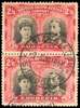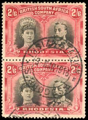 1910-13 2s6d brownish black and carmine-red, perf 14 vertical pair, 'hook' head plate, used with fine Insiza Station cds of 3 MAR 1916. Very scarce. RSC A