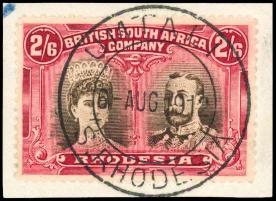 1910-13 2s6d sepia and deep crimson, perf 14, 'long gash' head plate. Used example on piece, with superb Umtali cds of 6 AUG 1912. SG 156