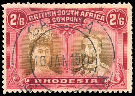 1910-13 2s6d brown and (aniline) brown-lake, 'mid gash' head plate, unplated. Used with near-complete Gatooma double-circle cds of 10 JAN 1920, a unique usage on Double Heads, remarkably on a rare stamp. Some blunt perfs, otherwise exceptional. RSC C