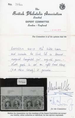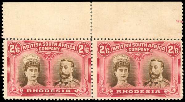 1910-13 2s6d deep brown and brown-lake, perf 14 top marginal pair with small part imprint, 'mid gash' head plate, pos. 2 gash in Queen's ear. O.g., small hinge remainder low on pos. 1, pos. 2 unmounted. The selvedge between the two pieces of margin is split and reinforced; the gum is crackly. An extremely rare multiple. BPA cert (1976) as SG 156a var. RSC E