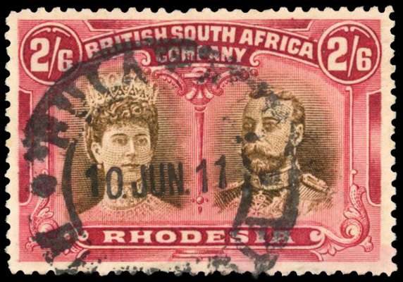 1910-13 2s6d red-brown and brown-lake, perf 14, 'mid gash' head plate, used with Bulawayo cds (double circle with dots) of 10 JUN 11, which is unusual and may be unrecorded. A few blunt perfs at base. RSC E variant