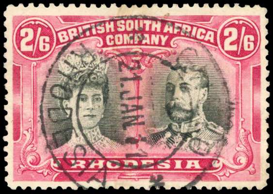 1910-13 2s6d black and rose-carmine, perf 14, 'long gash' head plate, used with neat sideways Gwelo cds of 21 JAN 11. SG 157