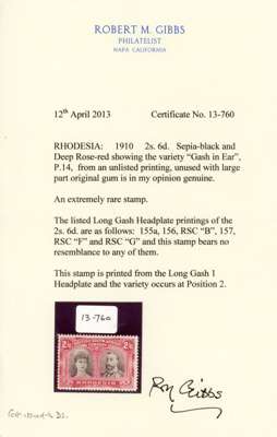 1910-13 2s6d sepia-black and deep rose-red, perf 14, 'long gash' head plate, pos. 2 long gash in Queen's ear. Large part o.g. example with Gibbs Certificate (2013), stating that this stamp “bears no resemblance” to any Long Gash listed shade. Rare.