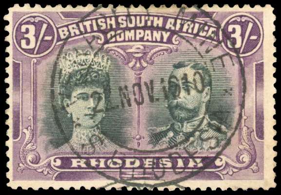 1910-13 3s green and violet, perf 14, ‘long gash’ head plate, used with an almost complete strike of the rare ‘VERACITY MINE / S. RHODESIA’ cds (Proud type D3), trivial soiling still an exceptional early usage. SG 158
