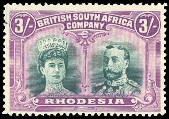 Rhodesia 1910-13 3s bright green and deep purple perf 14