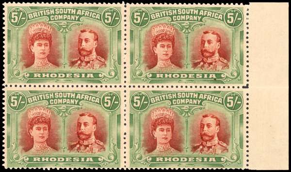 1910-13 5s vermilion and deep green, perf 14, ‘long gash’ head plate, right marginal block of 4 (pos. 39-40/44-45) showing ‘King’s wisp' flaw on lower left stamp, fresh o.g., a wonderful block which is believed to be unique. BPA cert (2007). SG 159