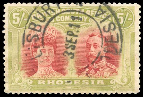 1910-13 5s scarlet and pale yellow-green, perf 14, ‘short gash’ head plate, used with large part Salisbury cds, dated ‘3 SEP 11’, slightly rubbed but very scarce commercially used. SG 160