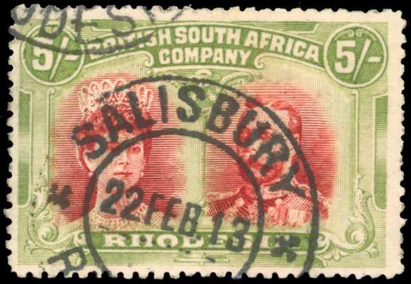 1910-13 5s crimson and yellow-green, perf 14, ‘long gash’ head plate, pos. 33, used with large part ‘SALISBURY / RHODESIA’ cds (Proud type D8), dated ‘22 FEB 13’, odd short or soiled perfs and small grease spot on reverse but a very rare usage. SG 160a