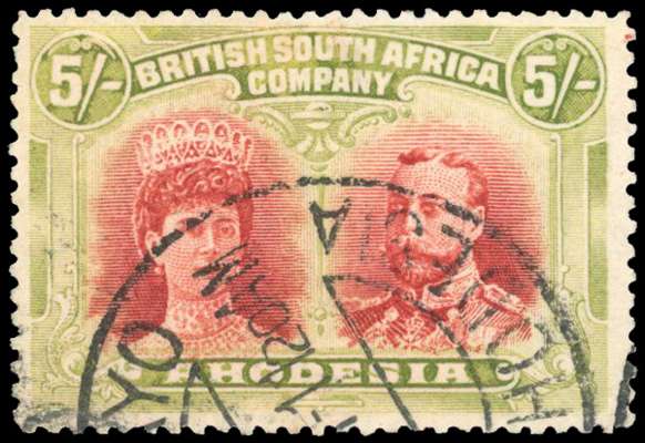 1910-13 5s carmine-lake and yellow-green, perf 14, ‘long gash’ head plate, c.t.o. with large part type H Bulawayo cds, showing time code ‘11.20 AM’, very scarce. RSC F