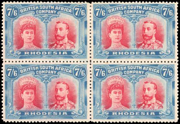 Rhodesia 1910-13 7s6d carmine and light blue perf 14 block of 4