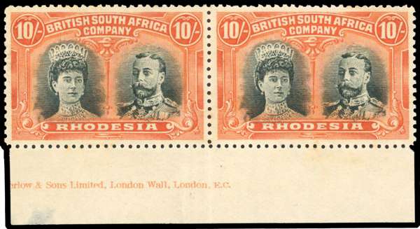 Rhodesia 1910-13 10s deep myrtle and orange imprint pair