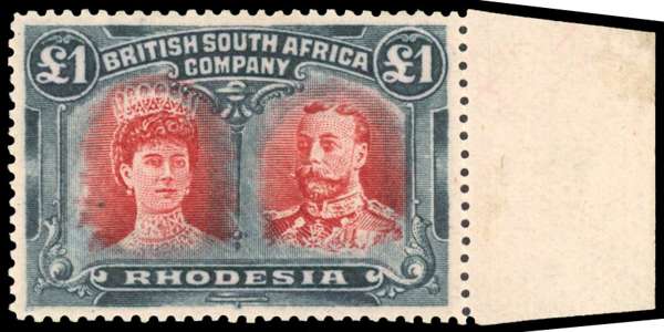 1910-13 £1 carmine-red and slate-black, perf 14, ‘hook’ head plate, right marginal, large part o.g., a very fine example of this rare shade variant. RSC G variant