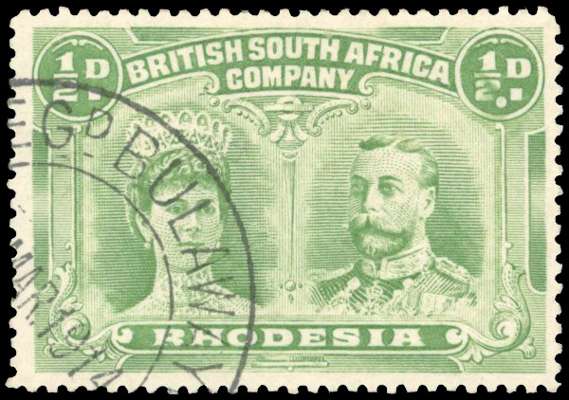 1910-13 ½d pale green, perf 15, showing the ‘Double Dot’ flaw (pos. 29, plate II), used with superb part ‘REGD BULAWAYO’ cds dated ‘MAR 1914’, very scarce. RJL 4