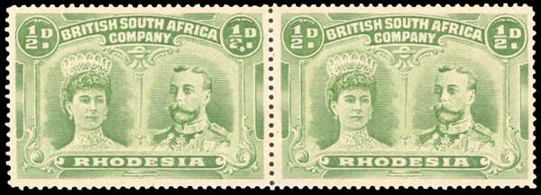 Rhodesia 1910-13 ½d pale green perf 15 horizontal pair with Double Dot flaw