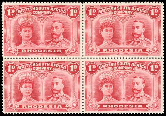 Rhodesia 1910-13 1d carmine perf 15 block of 4
