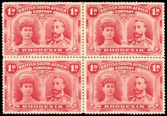 Rhodesia 1910-13 1d deep rosine perf 15 block of 4