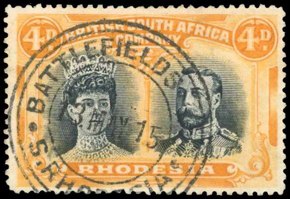 1910-13 4d blue-black and yellow-orange, perf 15, pos. 2 showing Queen's ‘thick ear’, very fine used with almost complete ‘BATTLEFIELDS / S. RHODESIA’ cds (Proud type D2 state 2), dated ‘13 MAY 15’, attractive and scarce from this position. RSC E
