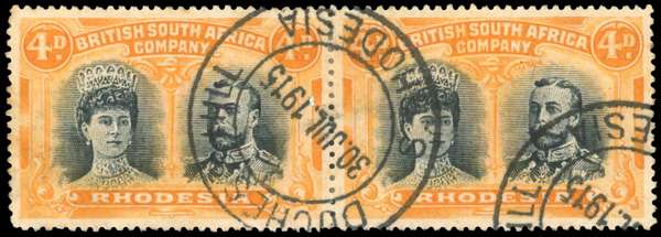 1910-13 4d blue-black and yellow-orange, perf 15, horizontal pair, the left stamp showing Queen's ‘thick ear’ (pos. 2), used with 'DUCHESS HILL / S. RHODESIA’ cds (Proud type D2), dated ‘30 JUL 15’, minor traces of toning still fine with fresh colours, an attractive and scarce multiple. RSC E