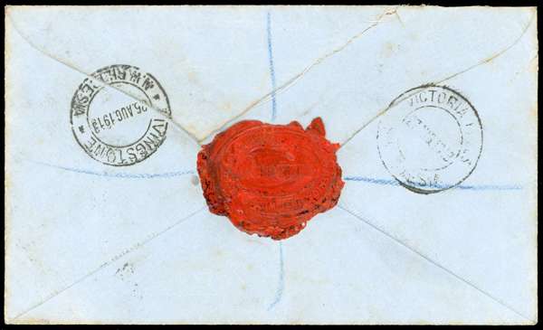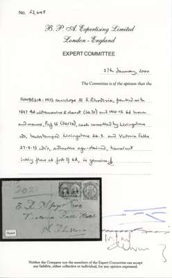 1913 (26 AUG) registered cover from Livingstone to the Victoria Falls Hotel, franked by 1897 4d ultramarine and claret (SG 71) and 1910-13 6d brown and mauve, perf 15 (SG 176), tied by individual strikes of ‘LIVINGSTONE / N.W. RHODESIA’ cds (Proud type D3), backstamped at Victoria Falls (27 AUG), slight faults but a rare internal usage of the 6d. BPA cert (2000).